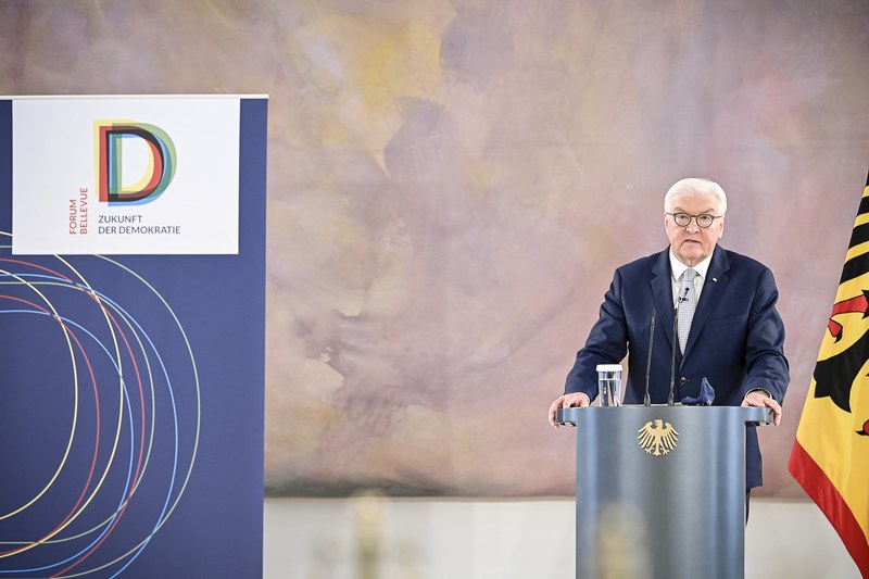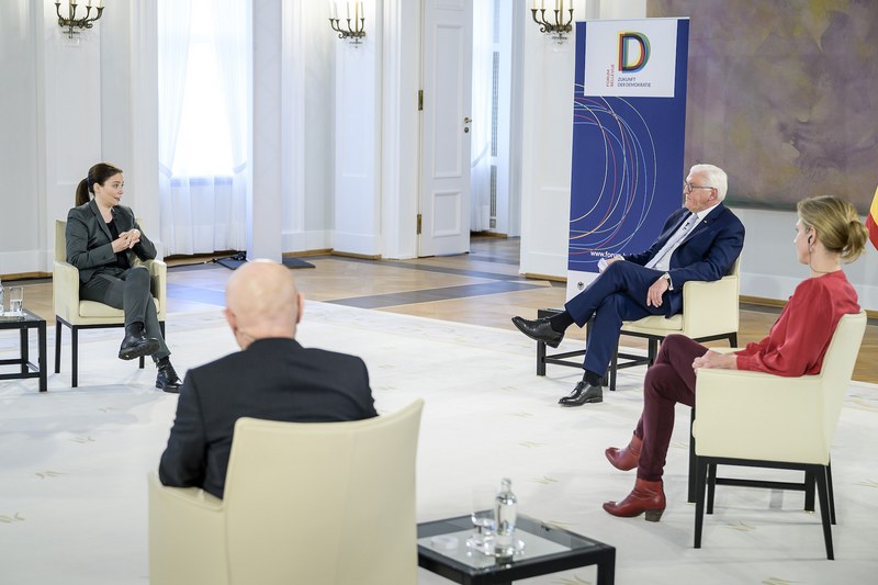 The Federal President discussed this issue at the tenth "Forum Bellevue on the Future of Democracy" with Maja Göpel (political economist and Scientific Director of The New Institute), Udo Di Fabio (Professor of Public Law at the Rheinische Friedrich-Wilhelms-Universität Bonn and former judge at the Federal Constitutional Court), Thea Dorn (author) and Wolfgang Merkel (political scientist and Director of the Research Unit for Democracy and Democratisation at the Berlin Social Science Center), who took part in the discussion via video link from Vienna. In view of the current pandemic in Germany, the discussion in the Great Hall of Schloss Bellevue had to take place without an audience and was streamed live.